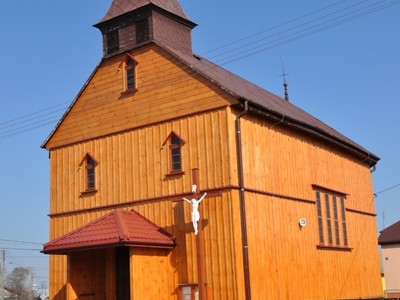Budowa i wyposażenie. Drewniany kościół jednonawowy, konstrukcji zrębowej. Orientowany. Salowy, bez wyodrębnionego z nawy prezbiterium, zamknięte trójbocznie z zakrystią na osi. Dach jednokalenicowy, kryty blachą z wieżyczką czworoboczną w części frontowej. Zwieńczoną blaszanym hełmem z latarnią. Wnętrze wyłożone boazerią. Strop płaski. Chór muzyczny wsparty na dwóch słupach. Podłoga murowana.