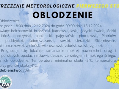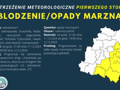 Przebieg: Prognozuje się gęste mgły, w zasięgu których widzialność może miejscami wynosić 100 m. W rejonie mgieł przy ujemnej temperaturze gdzieniegdzie ślisko.