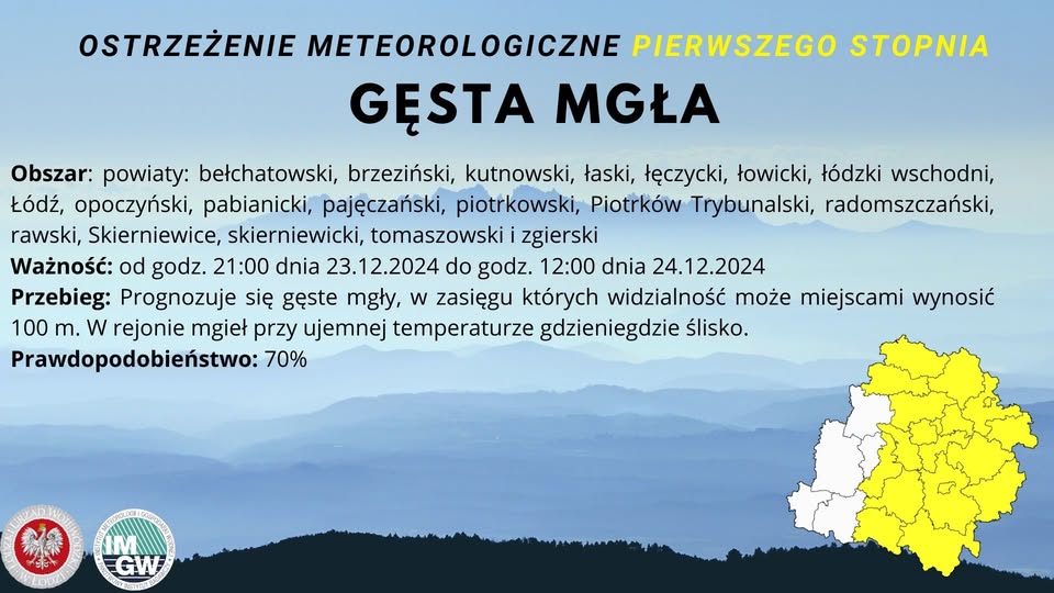 Instytut Meteorologii i Gospodarki Wodnej - IMGW PIB wydał ostrzeżenie meteorologiczne I stopnia dotyczące gęstej mgły.