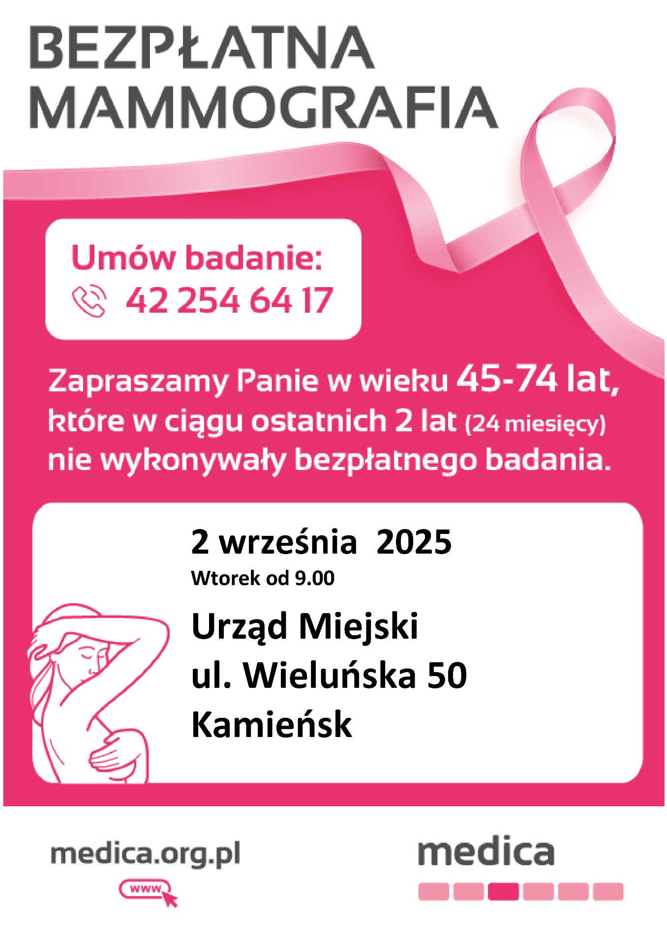 Zapraszamy wszystkie mieszkanki gminy Kamieńsk w wieku 45-74 lat, które przez ostatnie 24 miesiące nie wykonywały mammografii na bezpłatne badanie mammograficzne finansowane przez Narodowy Fundusz Zdrowia.
