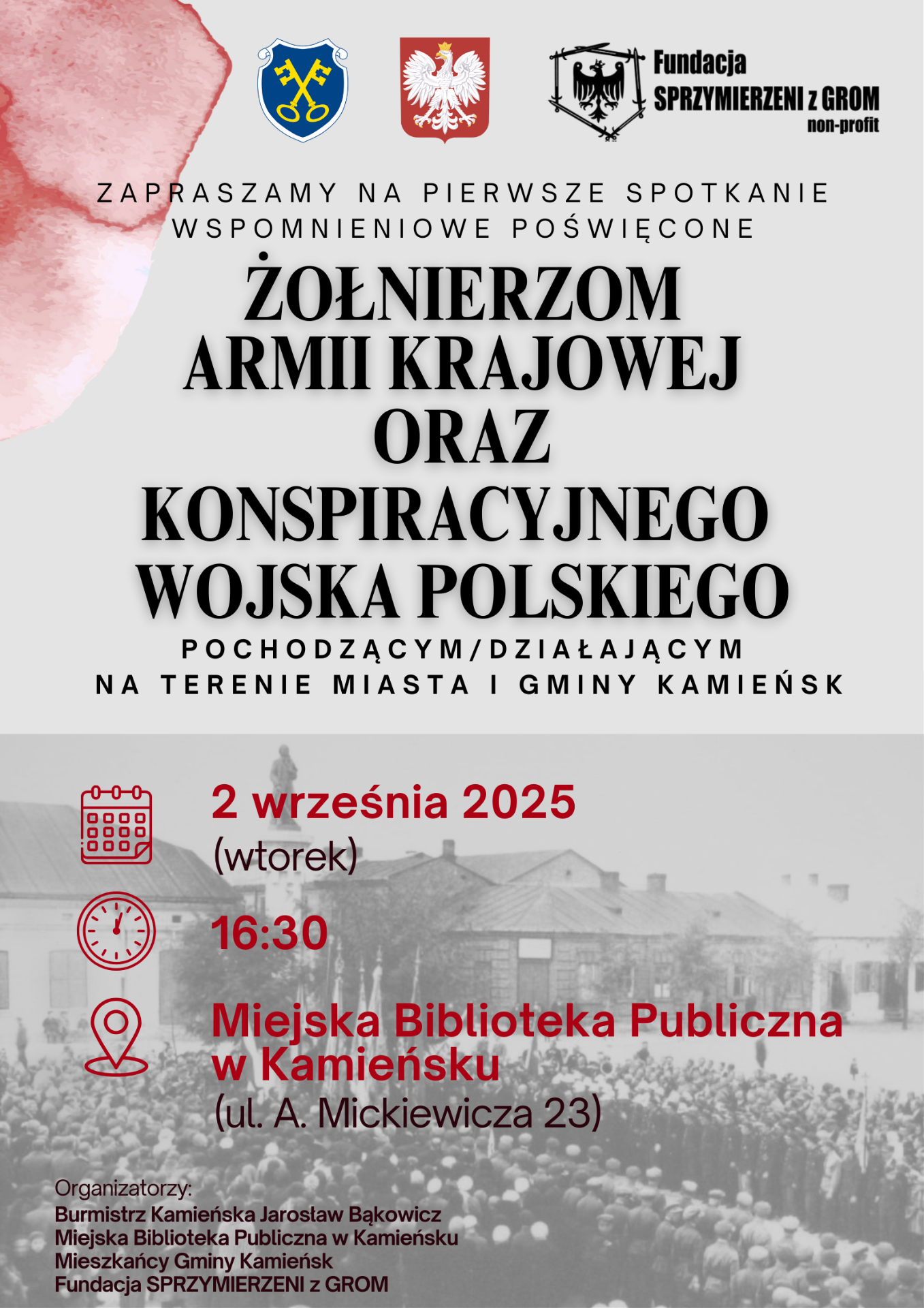 Serdecznie zapraszamy na pierwsze spotkanie wspomnieniowe poświęcone Żołnierzom Armii Krajowej oraz Konspiracyjnego Wojska Polskiego, pochodzącym i działającym na terenie miasta i gminy Kamieńsk.