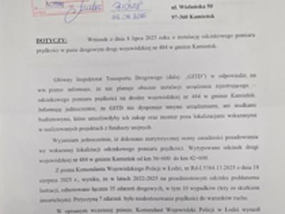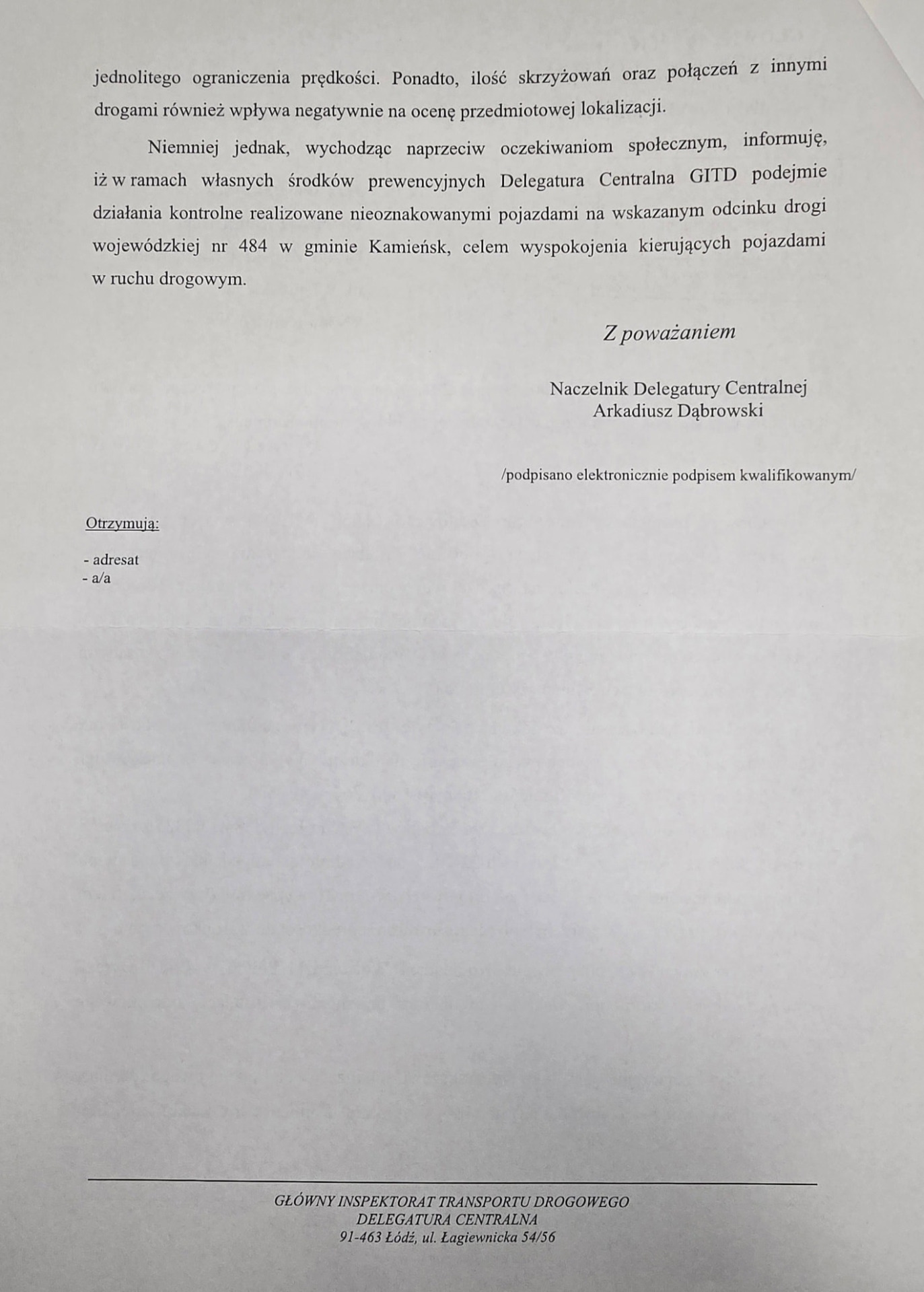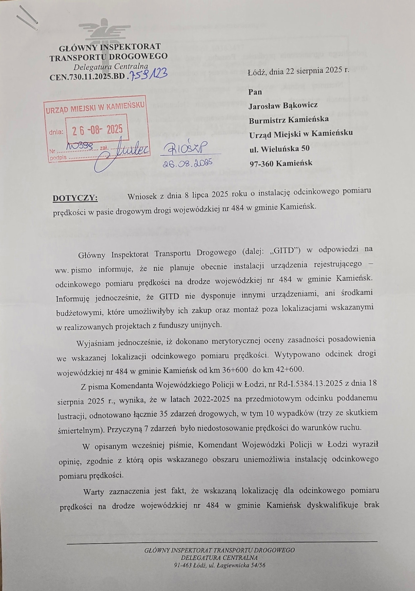 Informujemy, iż nie będzie odcinkowego pomiaru prędkości na drodze wojewódzkiej 484 pomiędzy Kaliskiem a Kamieńskiem. We wtorek otrzymaliśmy ostateczną, negatywną odpowiedź.