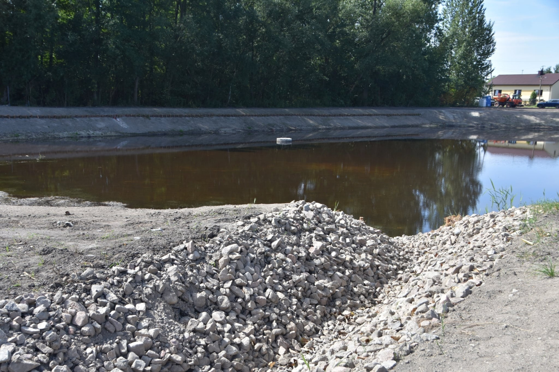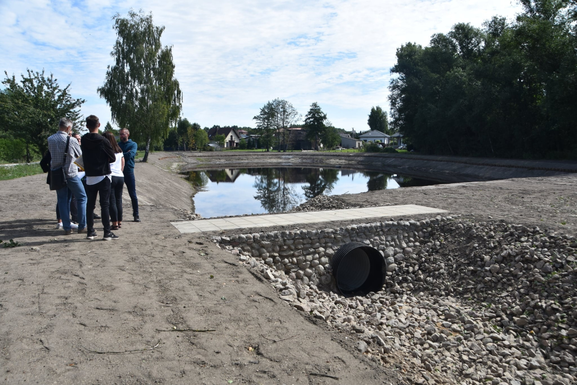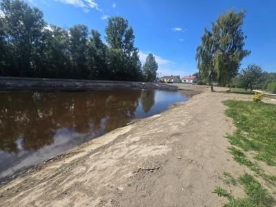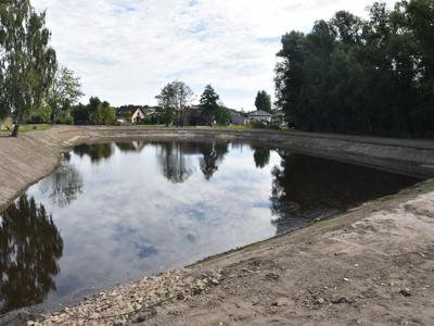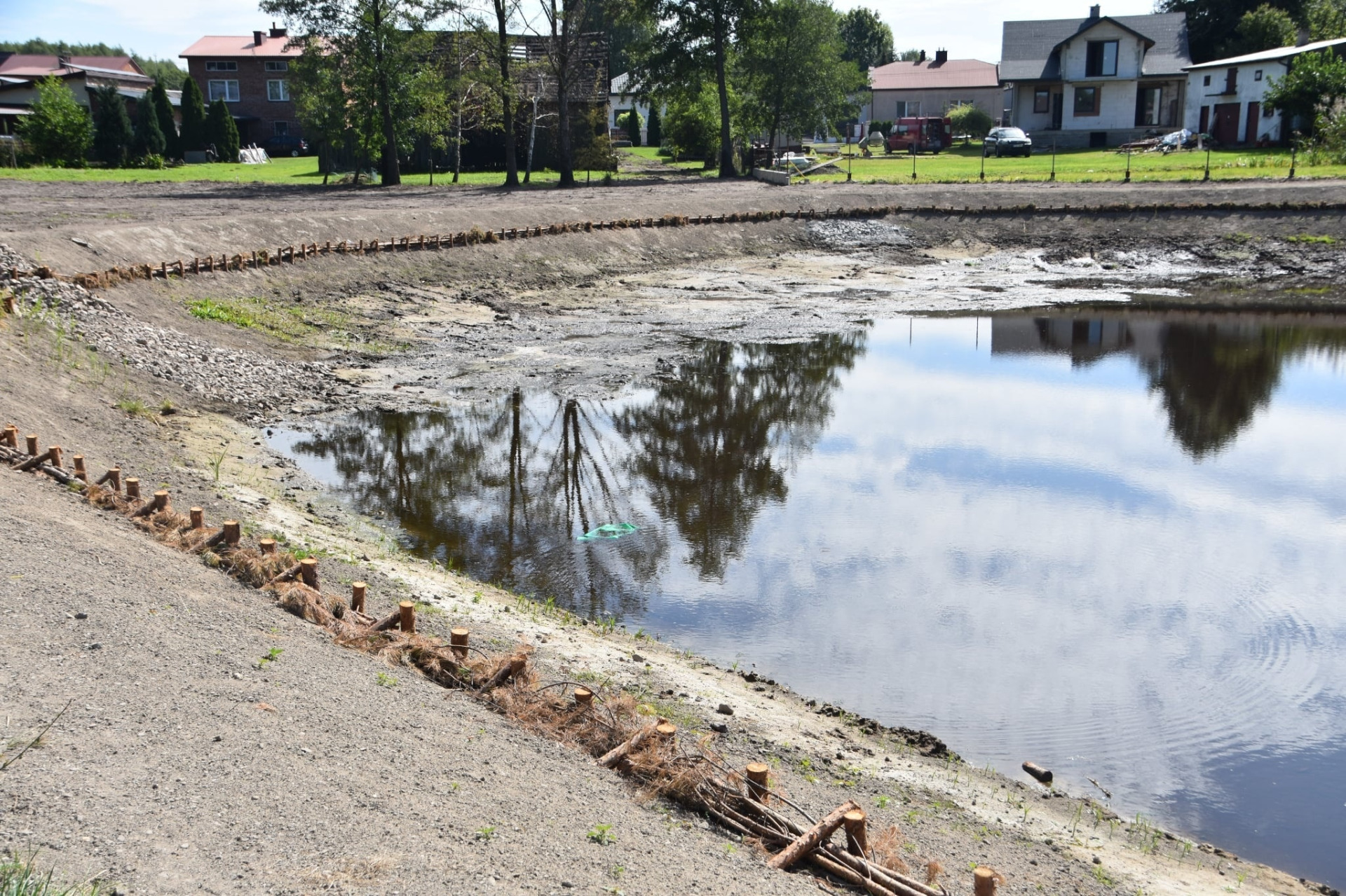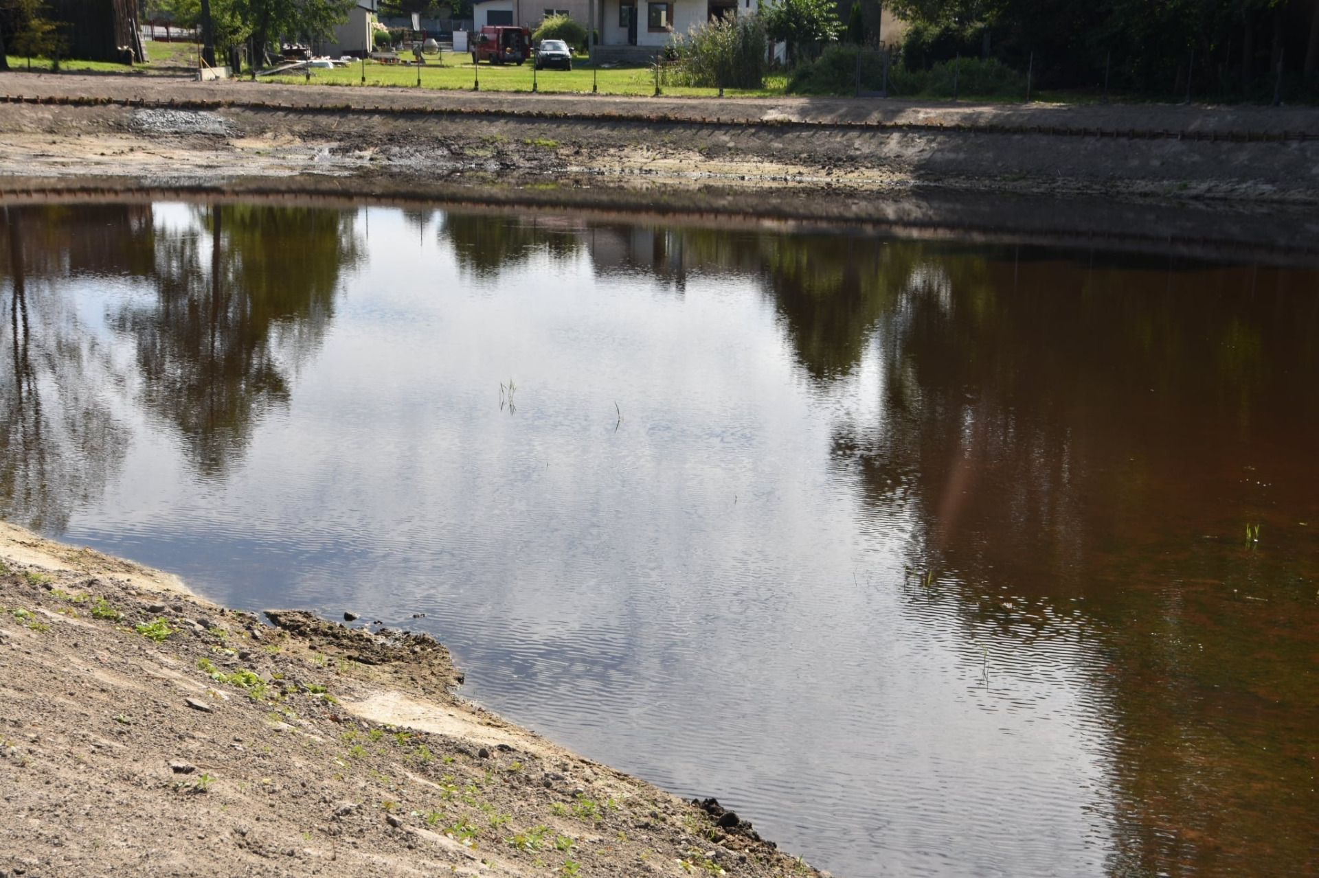 Czekamy jeszcze aż wzejdzie zasiana wokół zbiornika trawa.