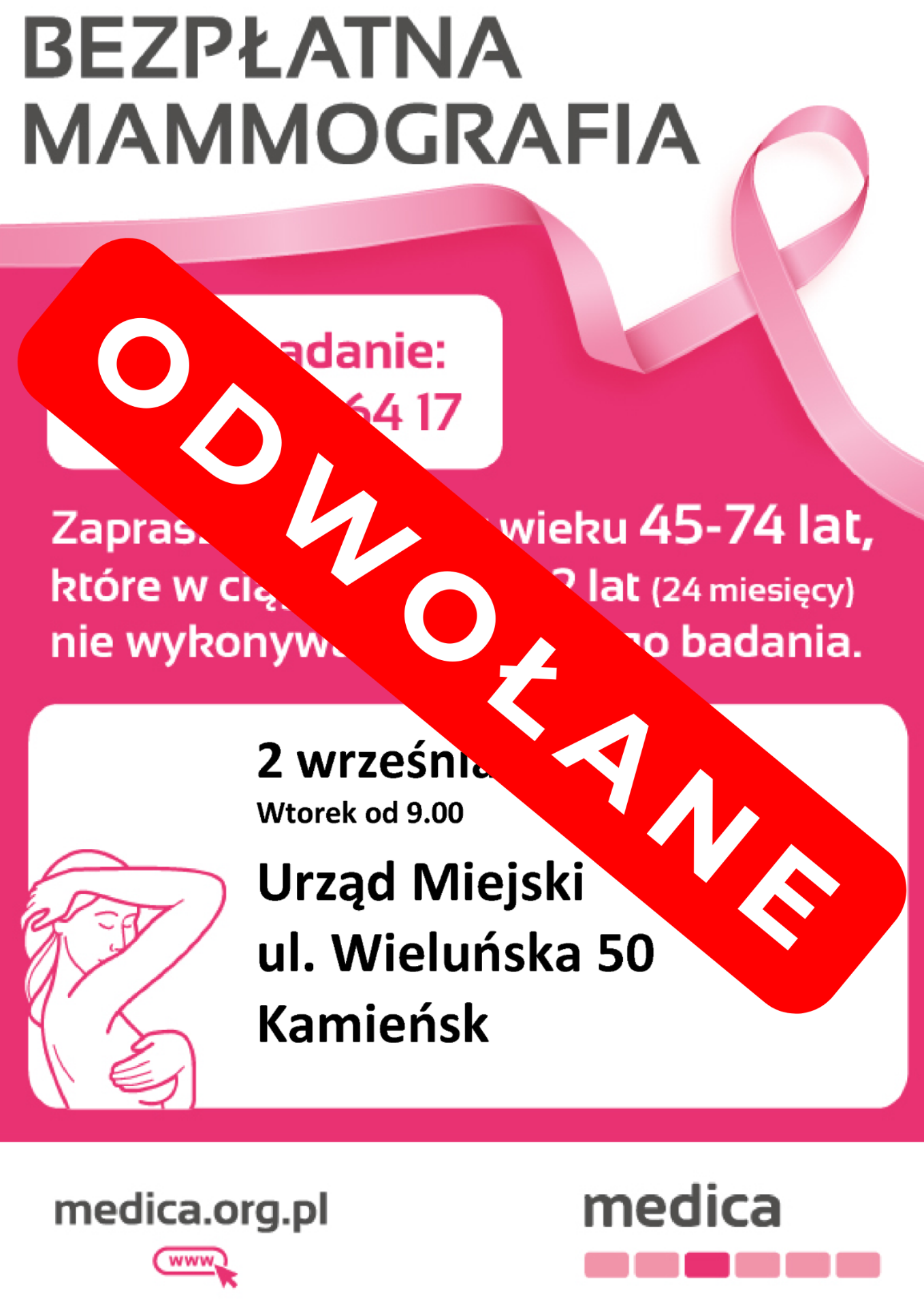 Informujemy, iż bezpłatne badania mammograficzne przewidziane na 2 września 2025 r. przy Udzędzie Miejskim w Kamieńsku, zostało odwołane z powodu awarii sprzętu do wykonywania badań.
