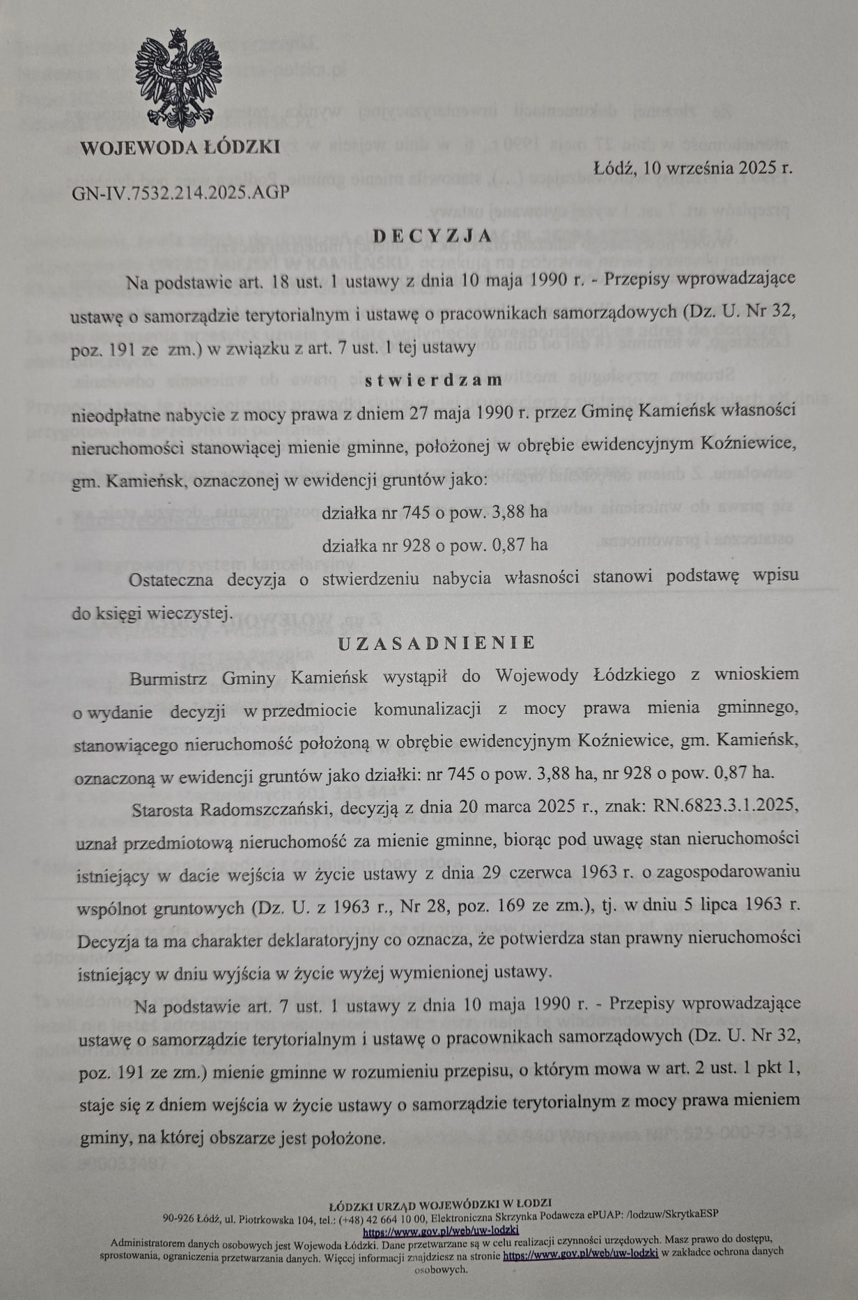 Gmina Kamieńsk stała się właścicielem dwóch istotnych, zaniedbanych od lat nieruchomości położonych na terenie sołectwa Koźniewice – tzw. „Lasku” oraz „Rudnizny”. Przejęcie tych działek otwiera drogę do realizacji długo oczekiwanych przez mieszkańców inicjatyw oraz inwestycji infrastrukturalnych i rekreacyjnych.