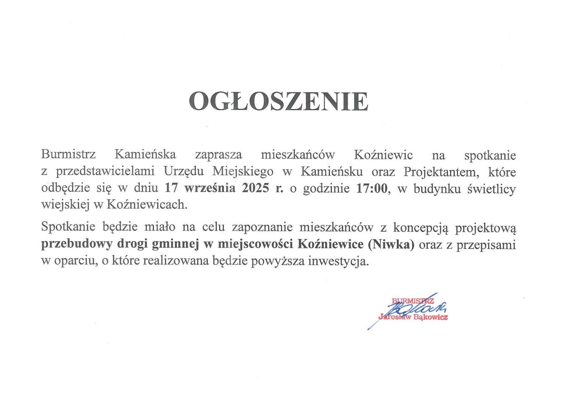 W imieniu Burmistrza Kamieńska serdecznie zapraszamy mieszkańców Koźniewic na spotkanie w sprawie planowanej przebudowy drogi na tzw. Niwce.