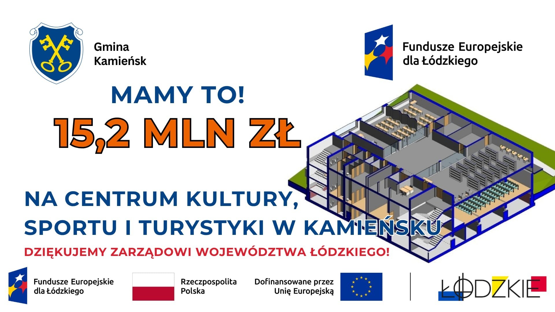 Z radością informujemy, że podpisaliśmy umowę o dofinansowanie w wysokości 15,2 mln zł na realizację projektu utworzenia Centrum Kultury, Sportu i Turystyki w Kamieńsku.