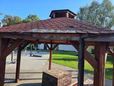 Wyremontujemy również dotkniętą zębem czasu altankę nad paleniskiem. Wymienimy stary i przeciekający gont na blachodachówkę nawiązującą do nowo budowanej altany. Remont przejdzie też konstrukcja wraz z malowaniem.