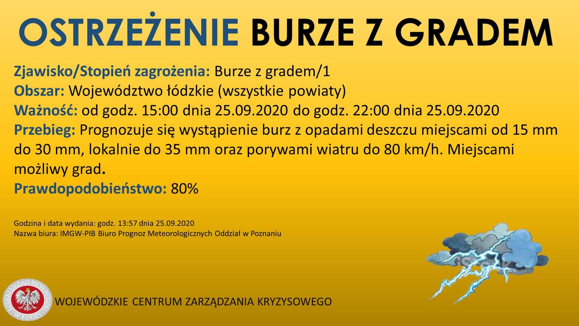 SMS IMGW-PIB OSTRZEGA: BURZE Z GRADEM/1 łódzkie/radomszczański od 15:00/25.09 do 22:00/25.09.2020 deszcz 35 mm, porywy 80 km/h.