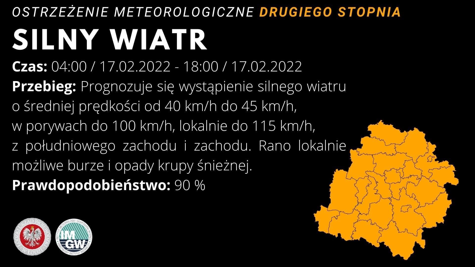 SMS IMGW-PIB OSTRZEGA: WIATR/2 łódzkie/radomszczański od 04:00/17.02 do 18:00/17.02.2022 prędkość do 50 km/h, porywy do 115 km/h, SW, W.