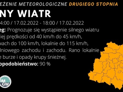 SMS IMGW-PIB OSTRZEGA: WIATR/1 łódzkie/radomszczański od 04:00/21.02 do 18:00/21.02.2022 prędkość do 40 km/h, porywy do 90 km/h, W.