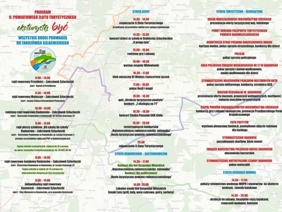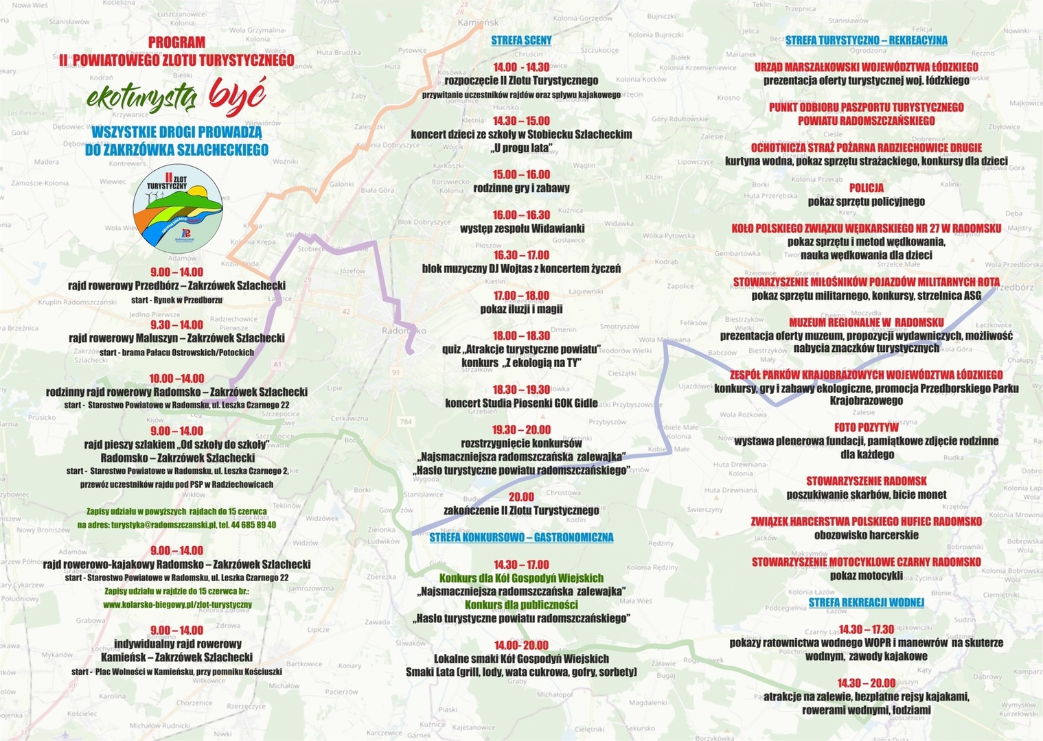 Już od porannych godzin w drogę wyruszą amatorzy rowerowych, pieszych i kajakowych wycieczek. Przewidziany jest rodzinny rajd rowerowy zapraszający do wspólnej aktywności całe rodziny. Na wszystkich zainteresowanych czekać będą liderzy, którzy wyznaczonymi szlakami poprowadzą uczestników do celu. Udział w rajdzie może wziąć każdy, kto zgłosi chęć uczestnictwa u organizatora Zlotu - Starostwa Powiatowego w Radomsku, e-mail:turystyka@radomszczanski.pl, tel. 44 685 89 40. Ograniczona liczba miejsc obowiązywać będzie jedynie podczas rajdu rowerowo – kajakowego, którego realizacją w ramach zadania publicznego zajmować się będzie Kolarsko - Biegowy Klub Sportowy Radomsko. W tym przypadku zapisy odbywać się będą poprzez stronę https://dostartu.pl/rajd-rowerowo-kajakowy