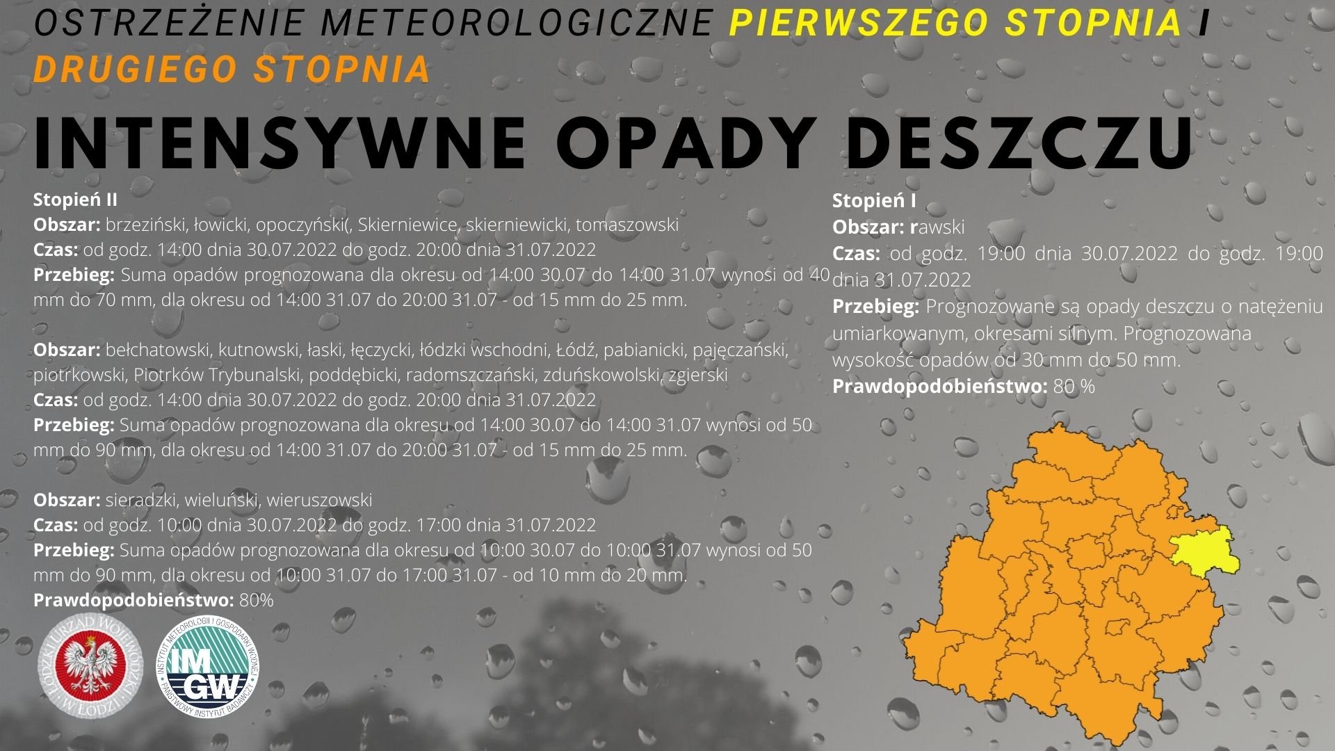 Instytut Meteorologii i Gospodarki Wodnej - IMGW PIB wydał ostrzeżenie meteorologiczne I i II stopnia dotyczące intensywnych opadów deszczu dla województwa łódzkiego.