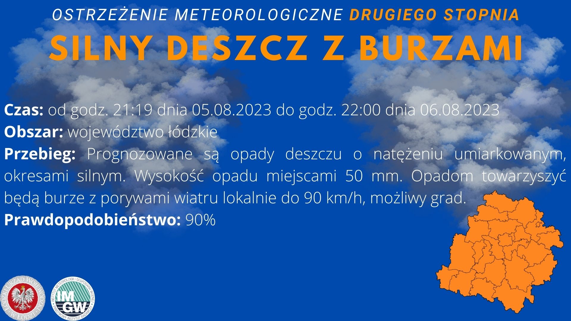 Instytut Meteorologii i Gospodarki Wodnej - IMGW PIB wydał ostrzeżenie II stopnia dotyczące silnego deszczu z burzami dla województwa łódzkiego.