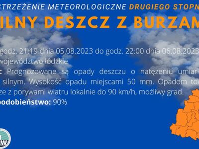 SMS IMGW-PIB OSTRZEGA: BURZE Z GRADEM/1 łódzkie/radomszczański od 12:00/19.08 do 22:00/19.08.2023 deszcz 35 mm, grad, porywy 65 km/h.