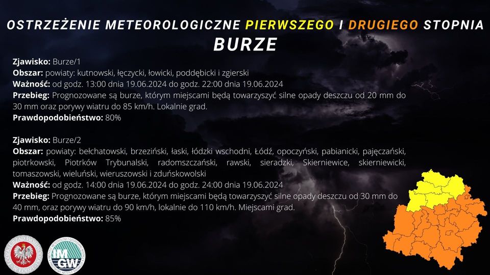 Instytut Meteorologii i Gospodarki Wodnej - IMGW PIB wydał ostrzeżenie meteorologiczne I i II stopnia dotyczące burz.