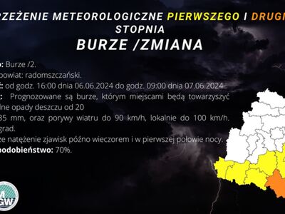 Instytut Meteorologii i Gospodarki Wodnej - IMGW PIB wydał ostrzeżenie meteorologiczne II i III stopnia dotyczące burz.