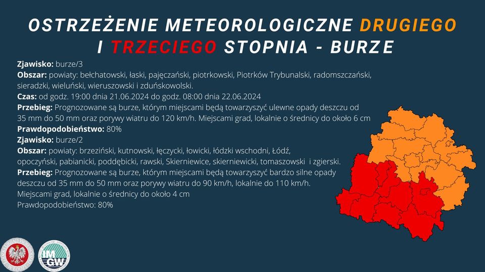 Przebieg: prognozowane są burze, którym miejscami będą towarzyszyć bardzo silne opady deszczu od 35 mm do 50 mm oraz porywy wiatru do 90 km/h, lokalnie do 110 km/h. Miejscami grad, lokalnie o średnicy do około 4 cm