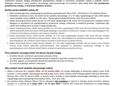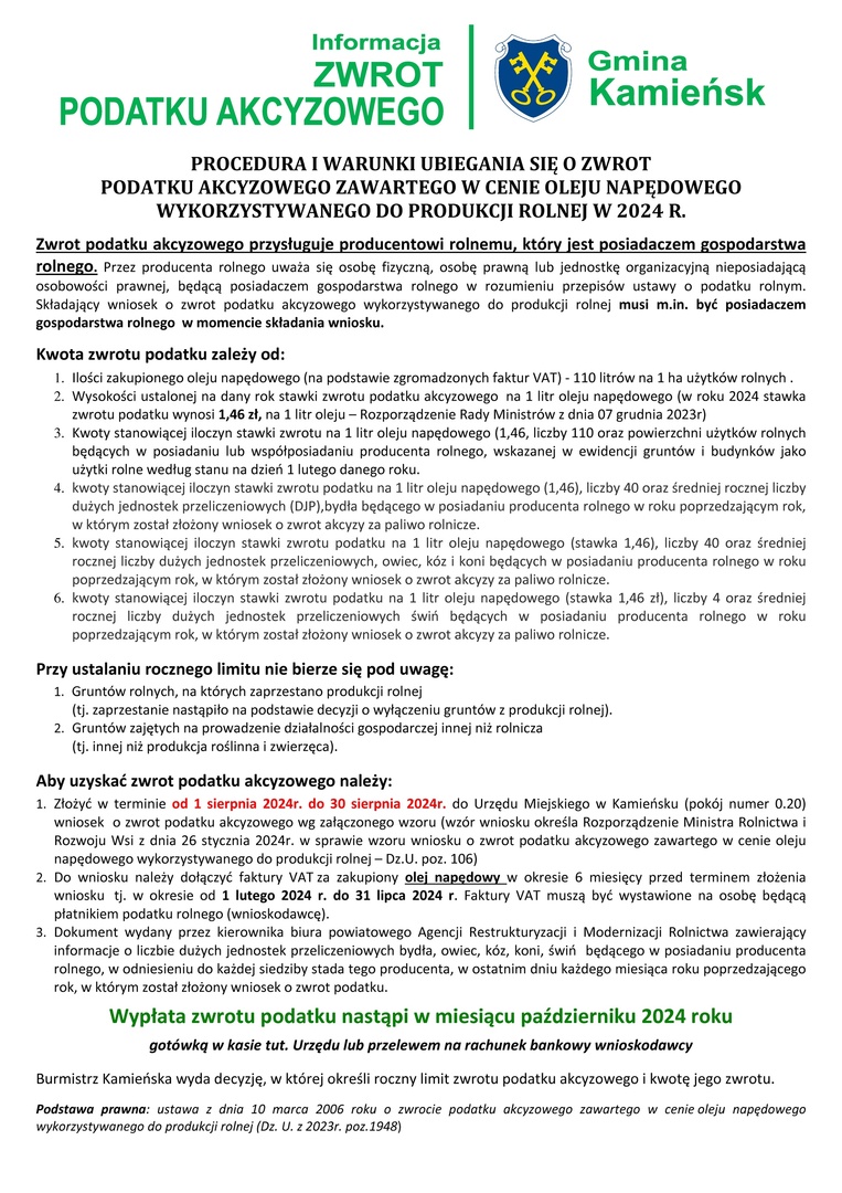 - Złożyć w terminie od 1 sierpnia 2024r. do 30 sierpnia 2024r. do Urzędu Miejskiego w Kamieńsku (pokój numer 0.20) wniosek o zwrot podatku akcyzowego wg załączonego wzoru (wzór wniosku określa Rozporządzenie Ministra Rolnictwa i Rozwoju Wsi z dnia 26 stycznia 2024r. w sprawie wzoru wniosku o zwrot podatku akcyzowego zawartego w cenie oleju napędowego wykorzystywanego do produkcji rolnej – Dz.U. poz. 106)