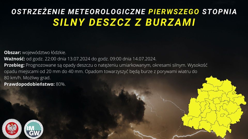 Instytut Meteorologii i Gospodarki Wodnej - IMGW PIB wydał ostrzeżenie meteorologiczne I stopnia dotyczące silnego deszczu z burzami