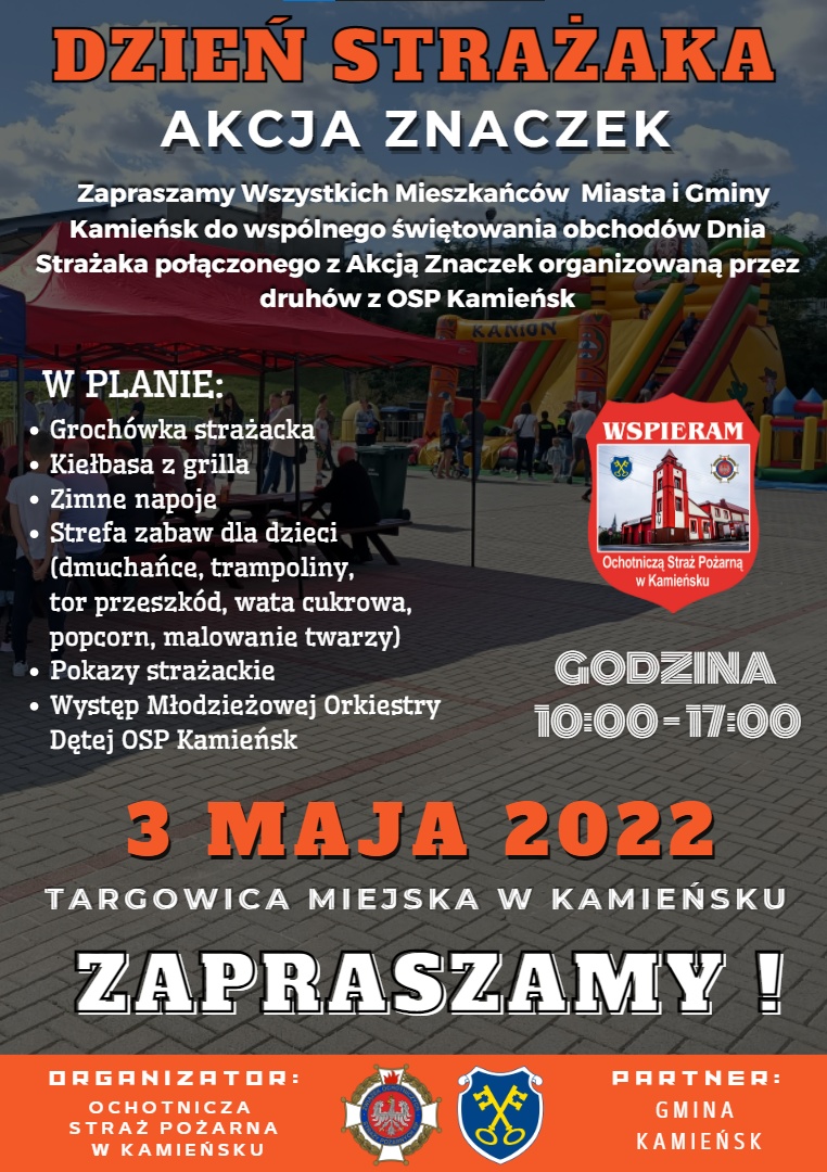 Zapraszamy Wszystkich Mieszkańców Miasta i Gminy Kamieńsk do wspólnego świętowania obchodów Dnia Strażaka połączonego z Akcją Znaczek organizowaną przez druhów z OSP Kamieńsk