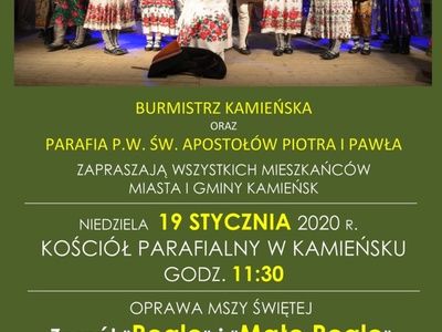 Burmistrz Kamieńska Bogdan Pawłowski oraz Parafia św. Apostołów Piotra i Pawła w Kamieńsku zapraszają wszystkich mieszkańców miasta i gminy Kamieńsk w niedzielę 19 stycznia 2020 roku na godz. 11.30 do Kościoła Parafialnego w Kamieńsku. Podczas Mszy św. oprawę wykona Zespół „Regle” i „Małe Regle” z Poronina. Bezpośrednio po Mszy św. Zespół „Regle” i” Małe Regle” wykona Jasełka góralskie autorstwa Anny Malaciny-Karpiel z choreografią opracowaną przez instruktorów Halinę Skupień i Jana Malacinę. Wspólne kolędowanie przygotowane przez instruktorów Ewelinę Rzadkosz i Pawła Gała uświetni Zespół „Małe Regle” . Muzyka pod kierownictwem Dawida Czernika.