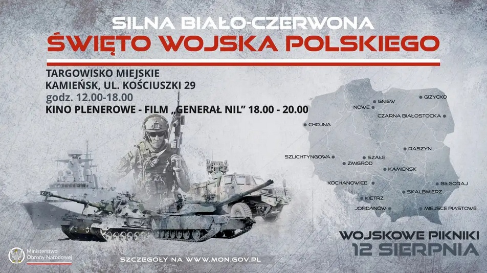 12 sierpnia w Kamieńsku na terenie Targowicy Miejskiej przy ul. Kościuszki 29 będzie można dodatkowo min. sprawdzić swoje umiejętności posługiwania się bronią dzięki nowo otwartej strzelnicy wirtualnej przy ZSP im. Tadeusza Kościuszki, posmakować lokalnych specjałów, a na zakończenie pikniku, o godzinie 18.00, w ramach „Kina Frontowego” obejrzeć film „Generał Nil”.