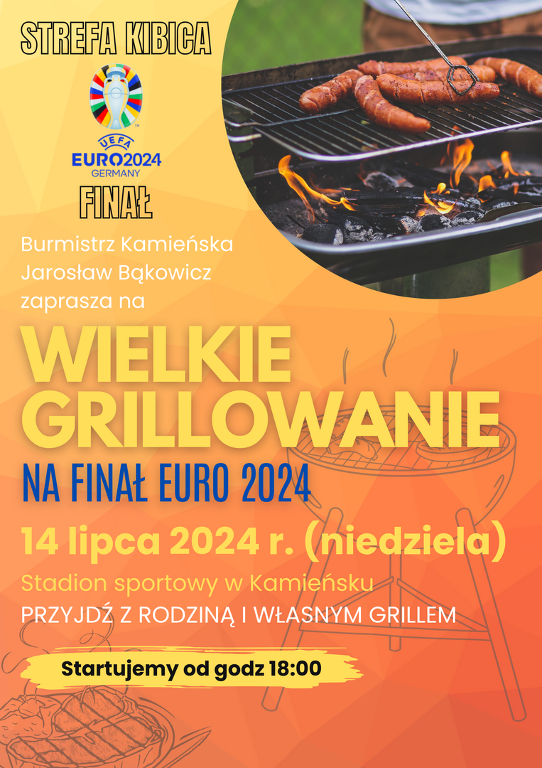 Już w najbliższą niedzielę (14 lipca) zapraszamy na STREFĘ KIBICA, w której obejrzymy mecz finałowy EURO 2024. Zanim jednak sportowe emocje to zapoczątkowujemy tradycję WIELKIEGO GRILLOWANIA z mieszkańcami. Zaczynamy od godz. 18:00 na Stadionie Sportowym w Kamieńsku.