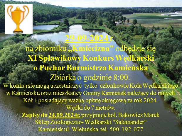 29-09-2024 r. na zbiorniku „Kmiecizna" odbędzie się XI Spławikowy Konkurs Wędkarski o Puchar Burmistrza Kamieńska